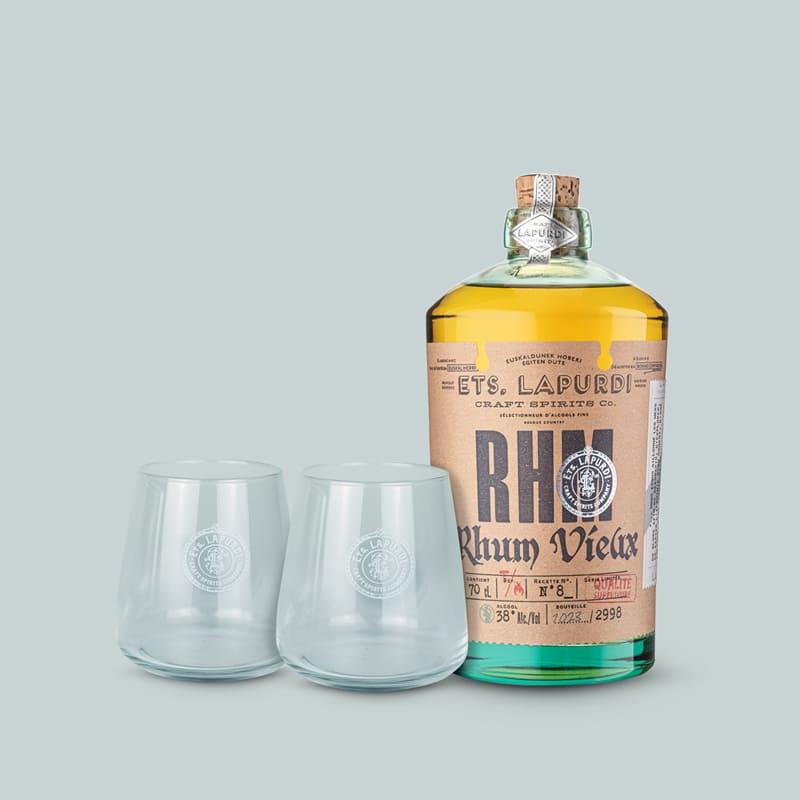 Pack Rhum Vieux RHM 3 ans d'âge 38° ETS. LAPURDI 70cl + 2 verres 35cl